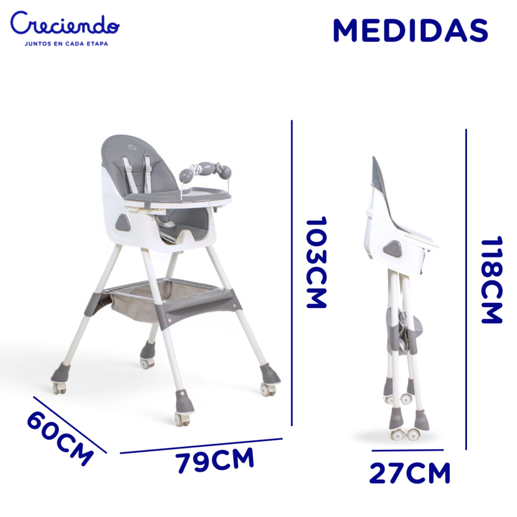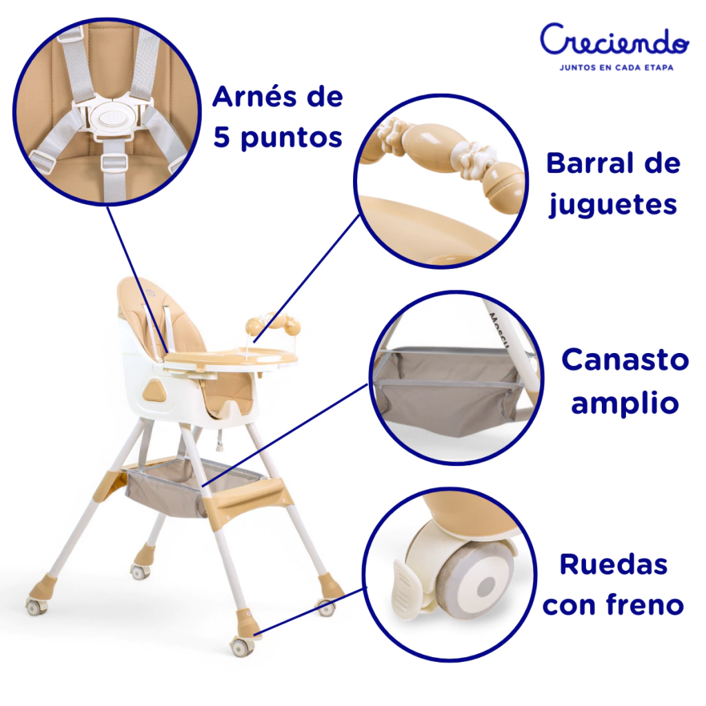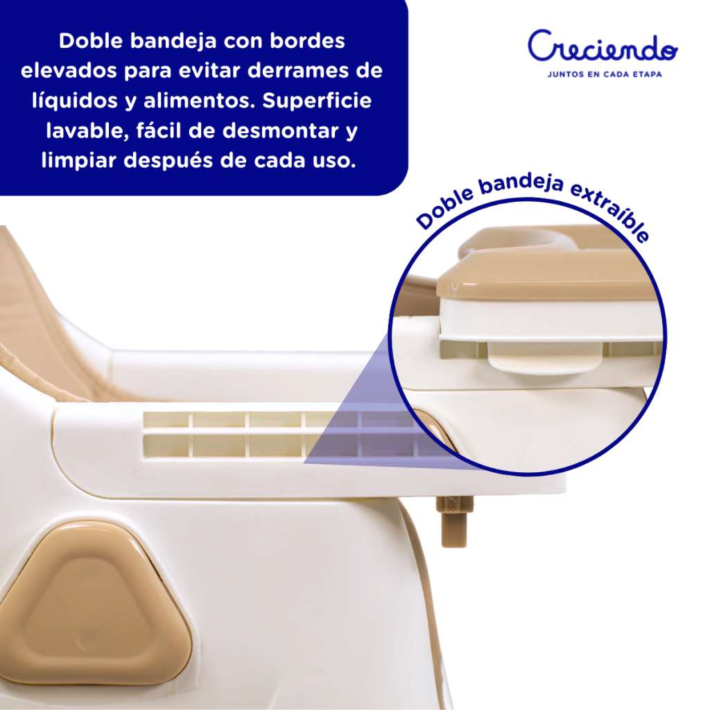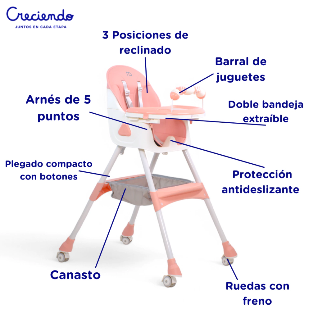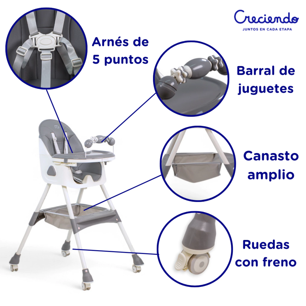 • Arnés de seguridad de 5 puntos: mantiene al bebé cómodo y seguro durante la comida.